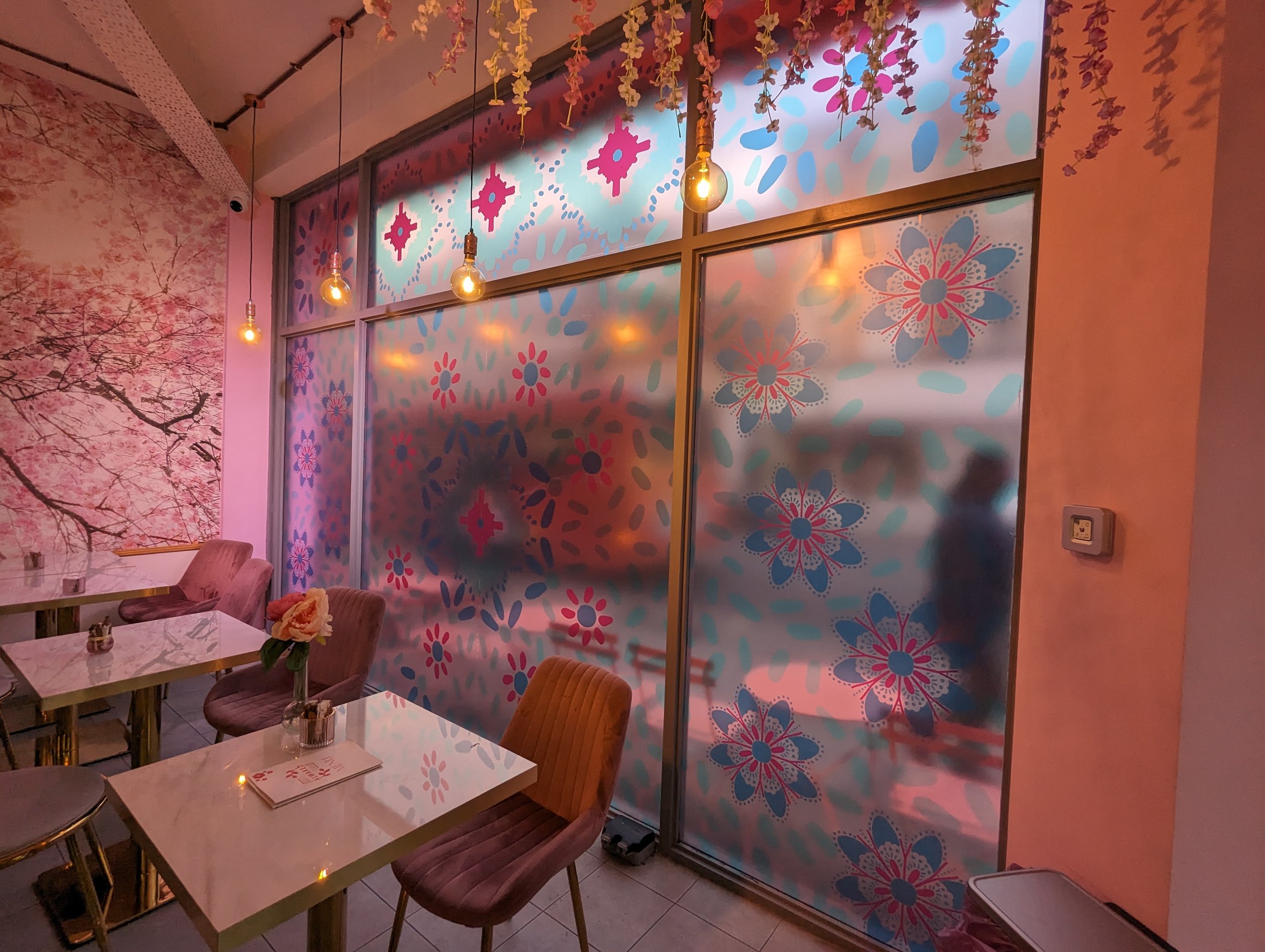 Café Beit Alwared translates as house of flowers, that along with the owners dual Lebanese/Moroccan heritage was the starting point for this design. Inspired by traditional tiles each window is filled with decorative and repetitive shapes in colours that compliment the cafe interior.